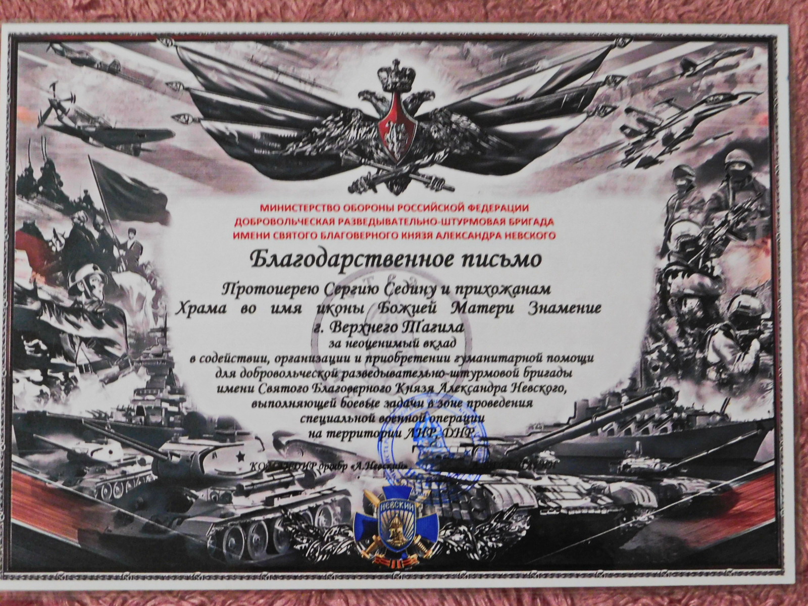 Не раз от Знаменского храма его бригаде отправлялась гумпомощь . От Добровольческой разведывательно-штурмовой бригады имени святого благоверного князя Александра Невского Александр привез Благодарственное письмо прихожанам Знаменского храма и настоятелю протоиерею Сергию Седину. А доброе дело во Славу Божию продолжается, в храме каждый день прихожане молятся о скорой Победе, о помощи Божией , Пресвятой Богородицы в ратном труде воинам и продолжают формировать по заявкам гумпомощь.