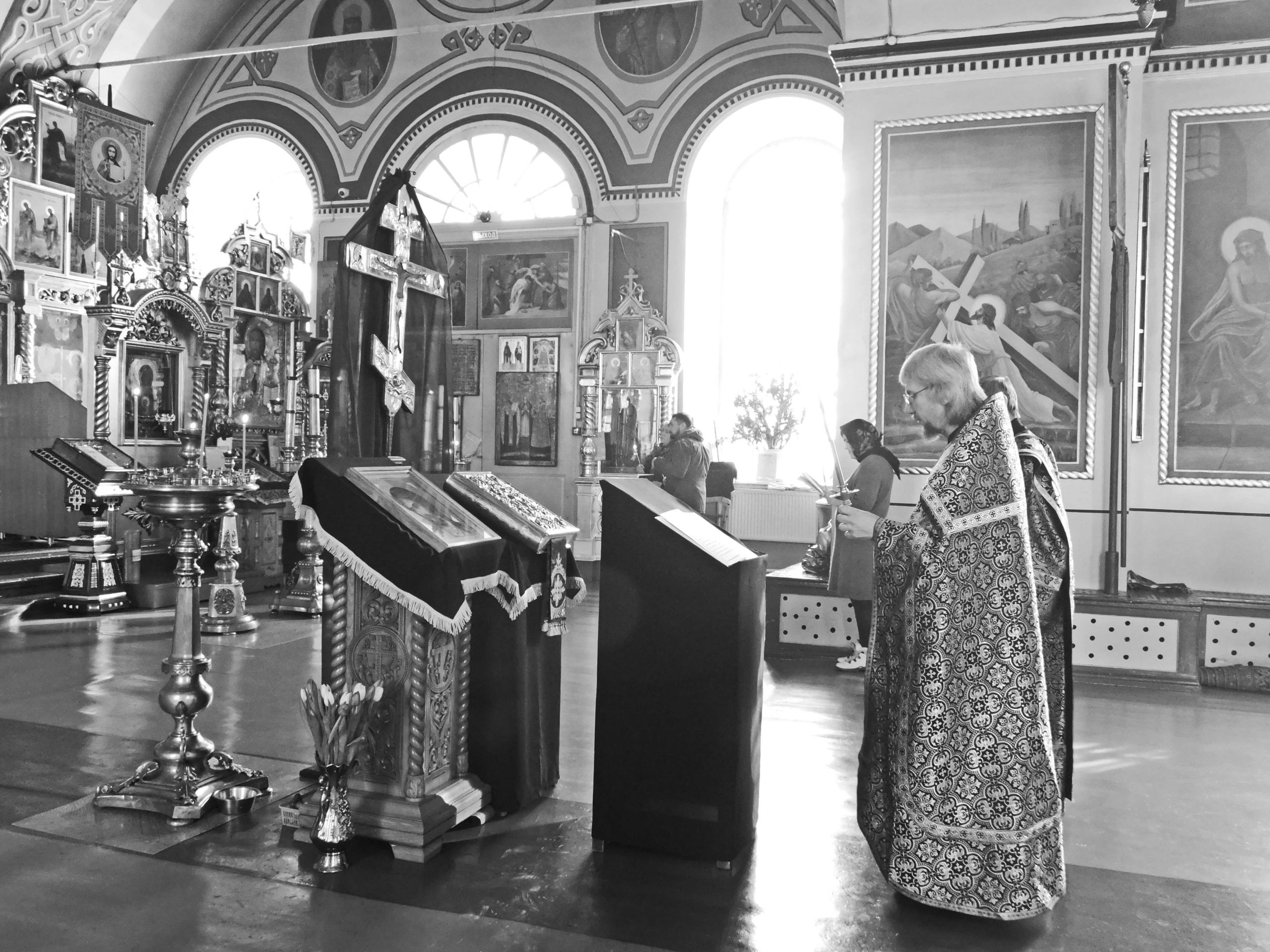 В Знаменском храме начиная с 8 марта и далее 15, 22 и 29 марта была отслужена Пассия — это великопостная вечерня с акафистом Страстям Христовым. И главное в ней — чтение одного из четырех Евангелий: от Матфея, Марка , Луки и Иоанна. Богослужение служили протоиерей Сергий Седин, протоирей Александр Поляков и церковнослужители храма.